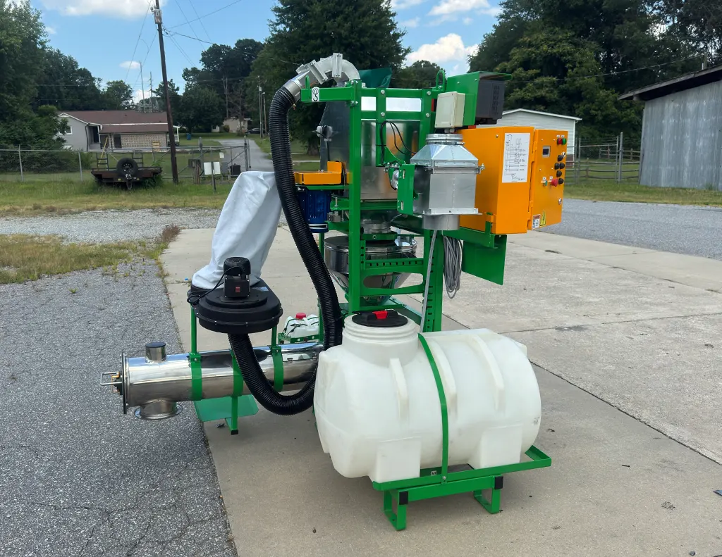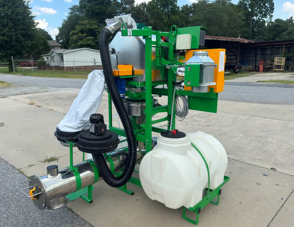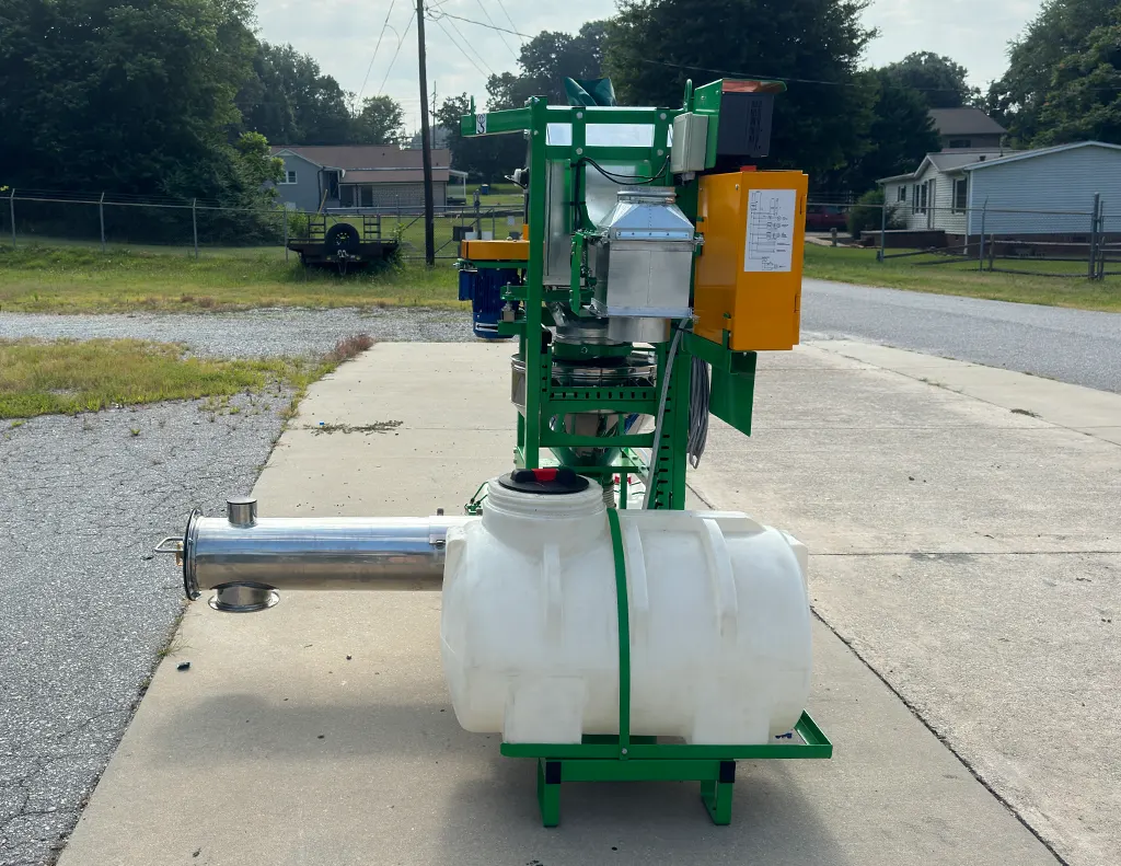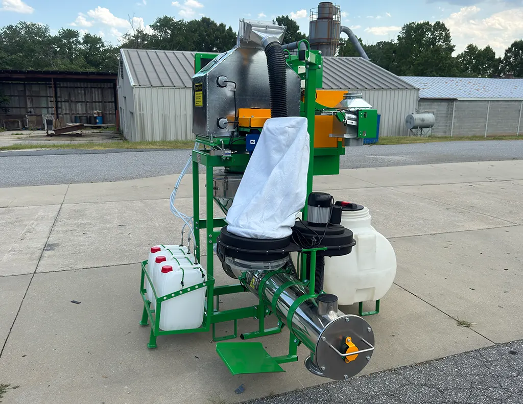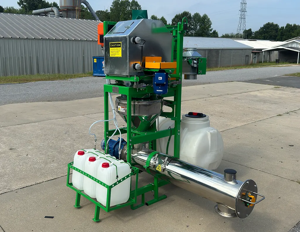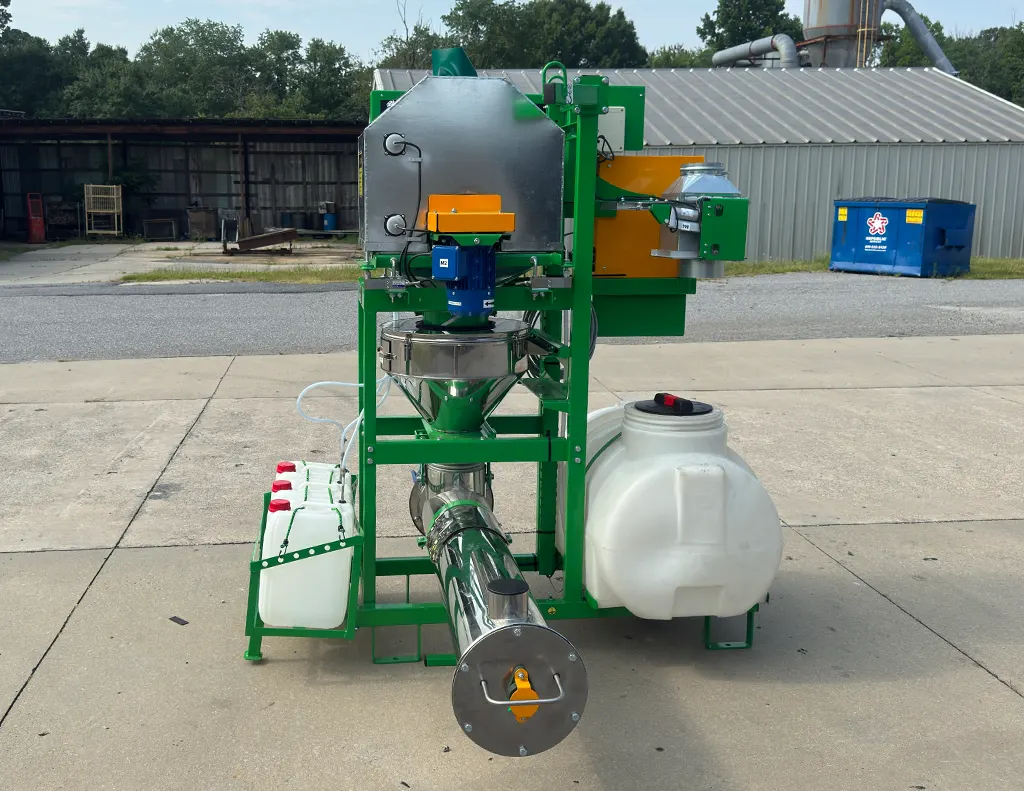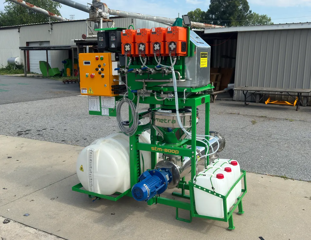 The Metra STM-800P seed treater. Its key feature is an automatic system that synchronizes seed weight and working fluid supply during treatment. If there is a lack of fluid or seeds, the process halts for purification. In automatic mode, the machine monitors the real-time seed weight at specified intervals and adjusts the supply of treatment solution as needed. Optional: SRP-3 separate fluid supply system, aspiration system.